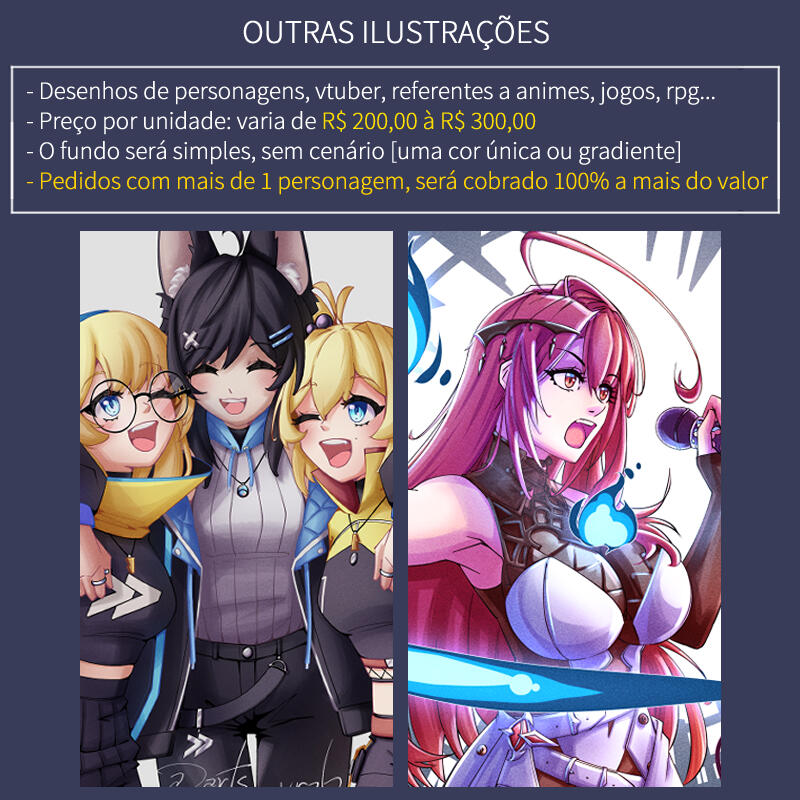 Obs: Por favor, antes de realizar qualquer pedido, confira os 'termos de serviço', 'método de pagamento' e 'termos de uso da arte' na aba TERMOS DE SERVIÇOS.